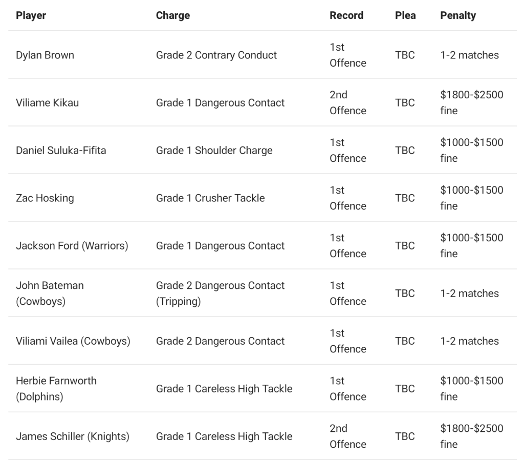 Brown isn’t the only one facing a match-ban, with two others under the North Queensland Cowboy’s, handed a charge of Grade 2 Dangerous Contact. This leaves John Bateman and Viliami Vailea sat out for the next few matches.